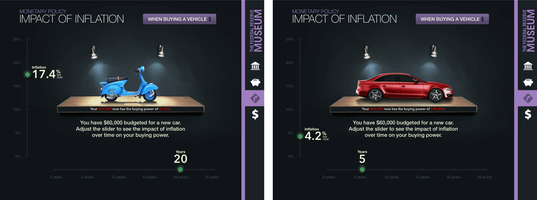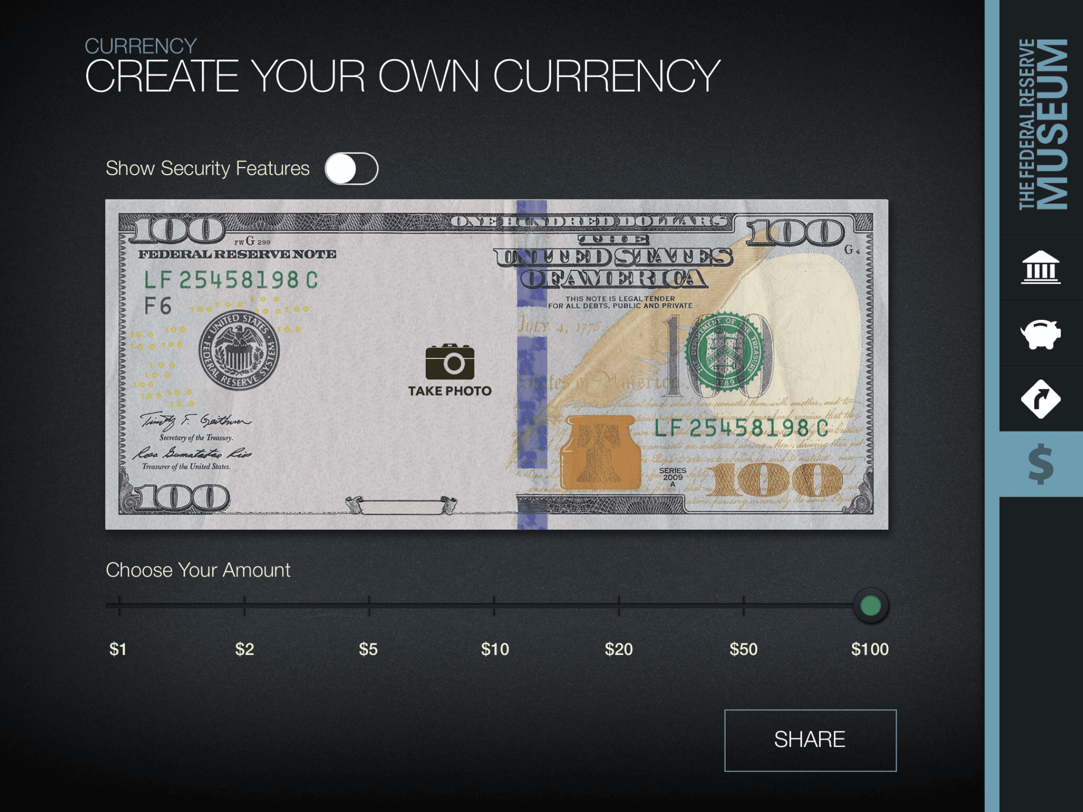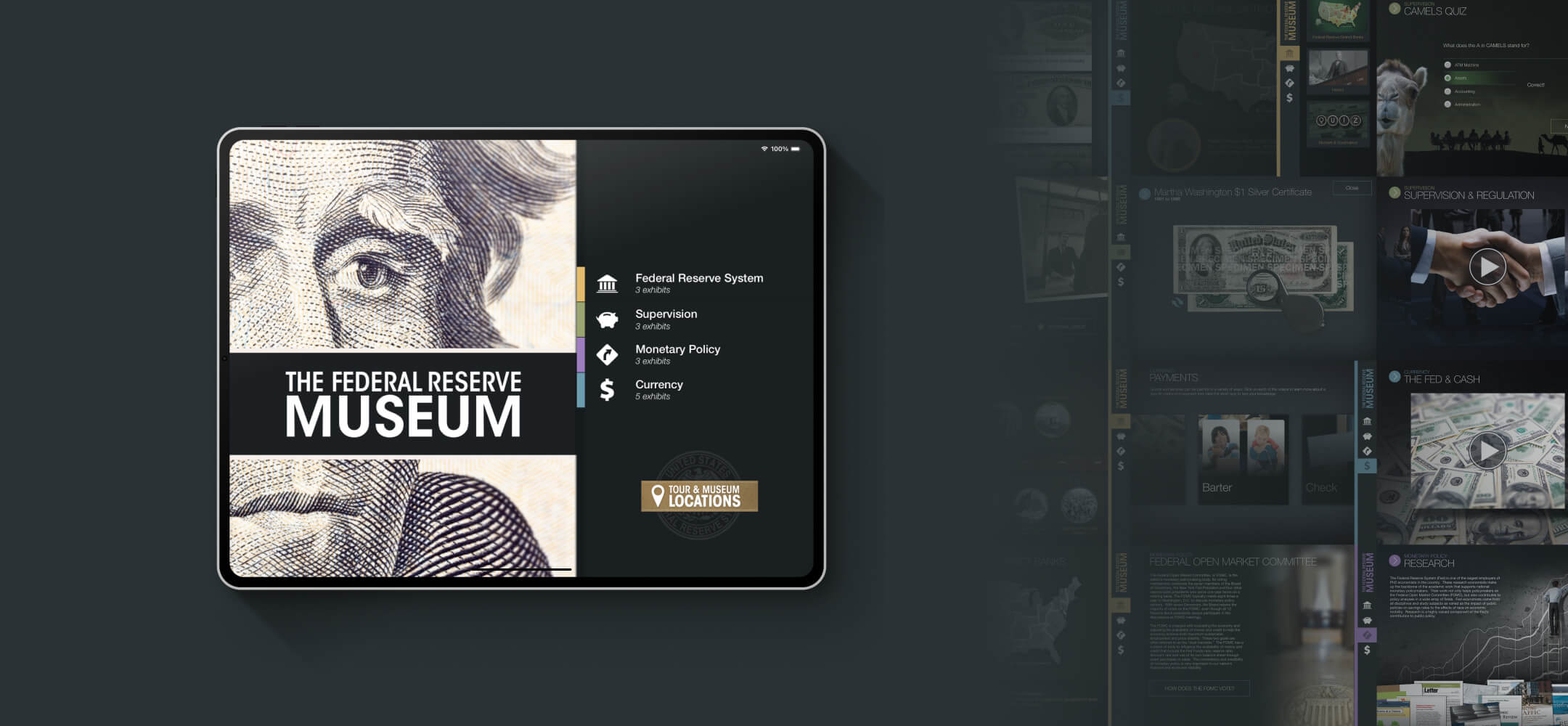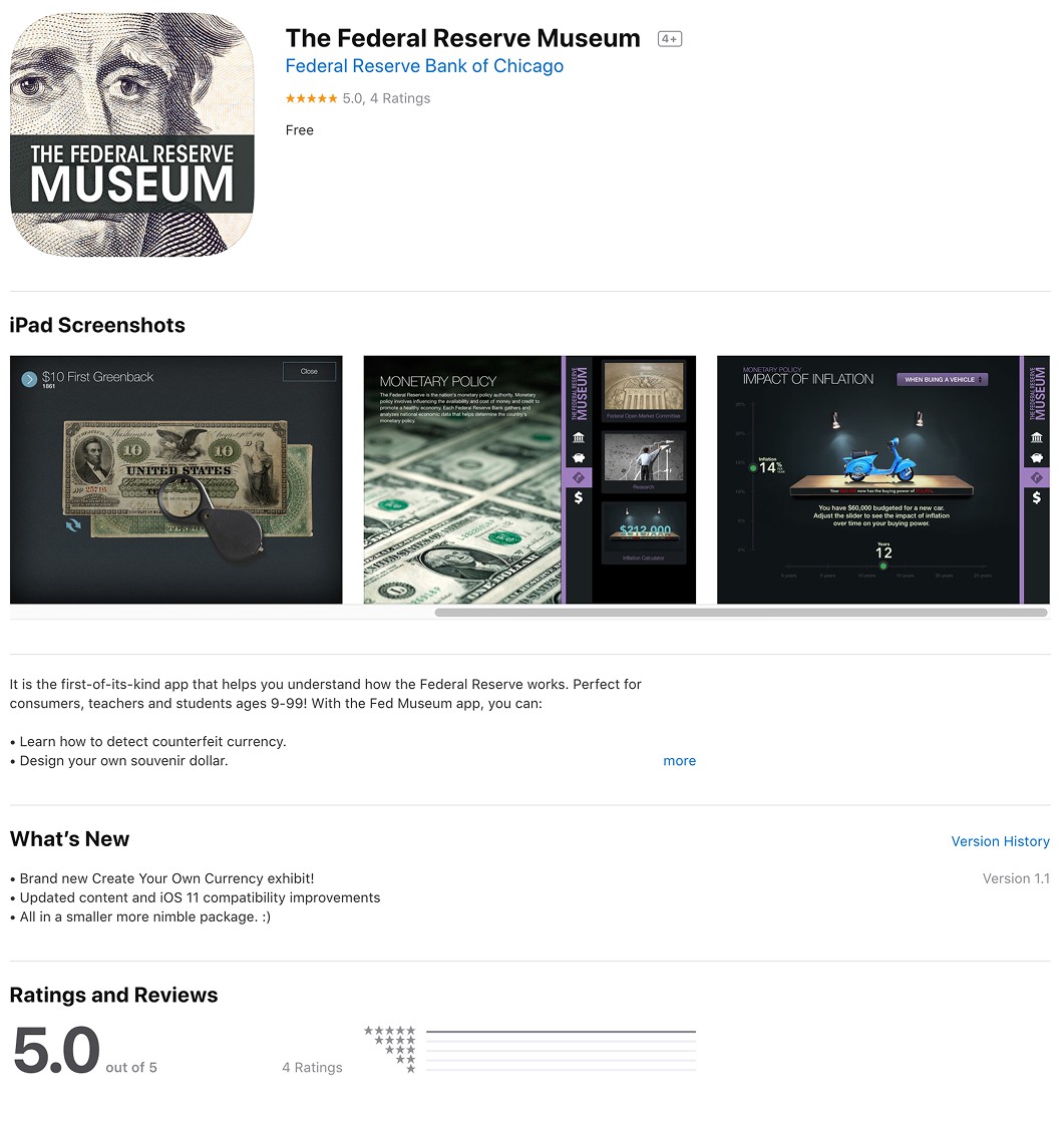 This iPad-only application was designed to be a fun and engaging way for both adults and children to learn more about the functions of the The Fed. There are four main sections and 20+ exhibits including timelines, videos, trivia games and even a way to “Create Your Own Currency”.