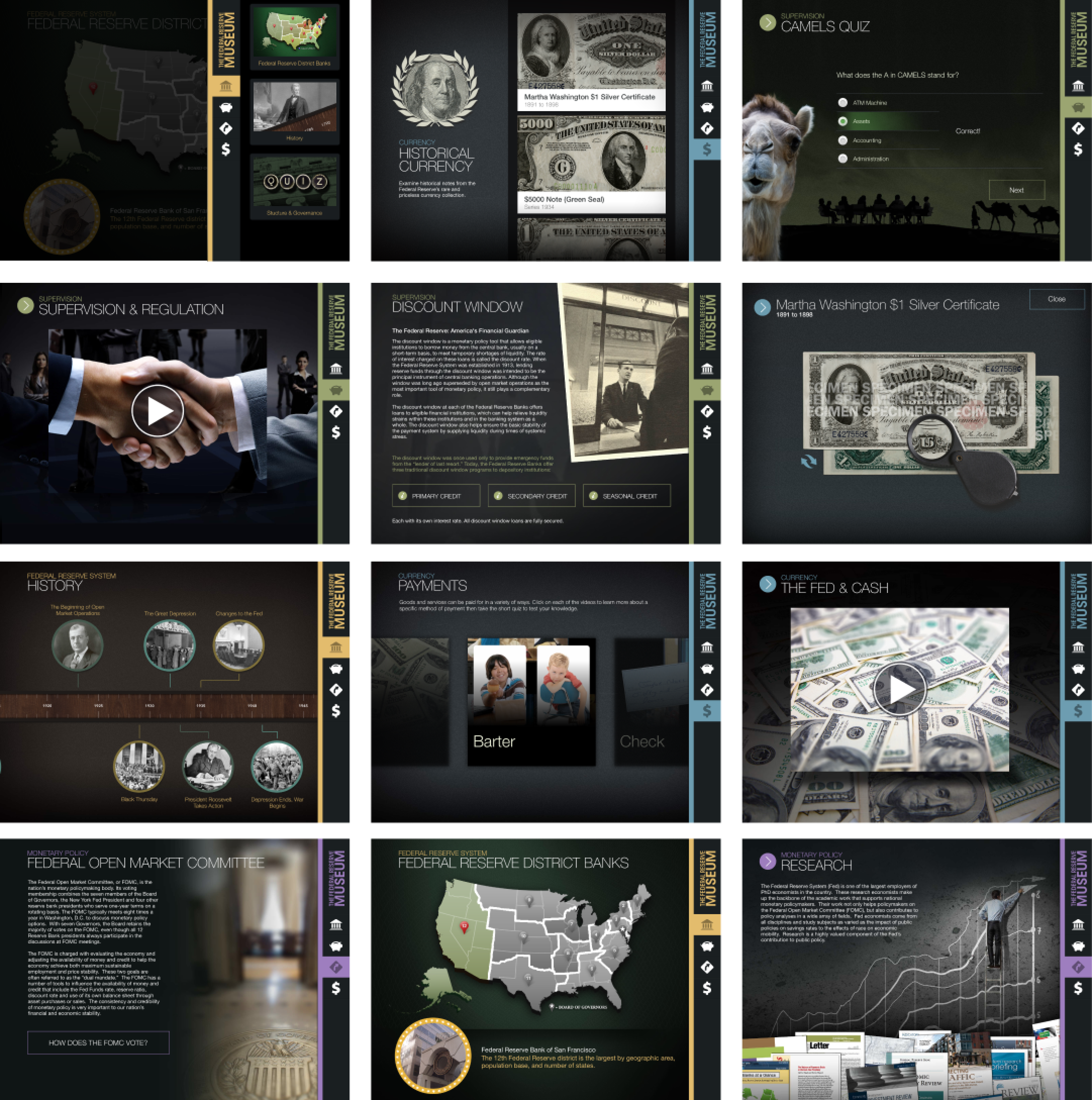 The Federal Reserve Museum featured four major sections with three exhibits each. Faced with dense, information-heavy content, I focused on making complex and often dry material engaging and approachable.