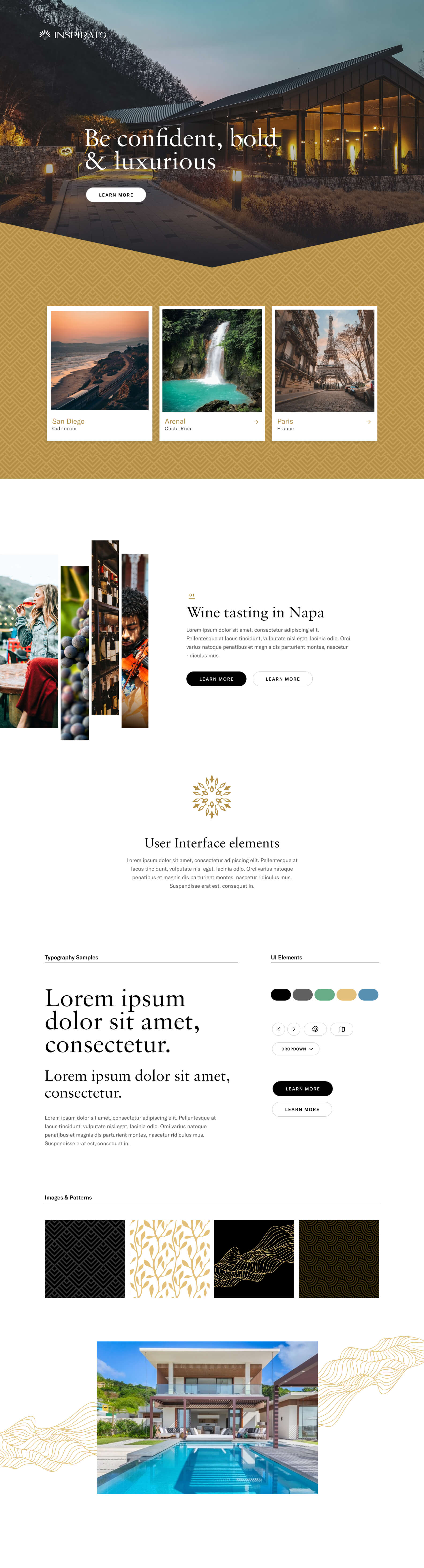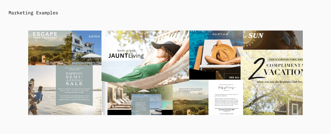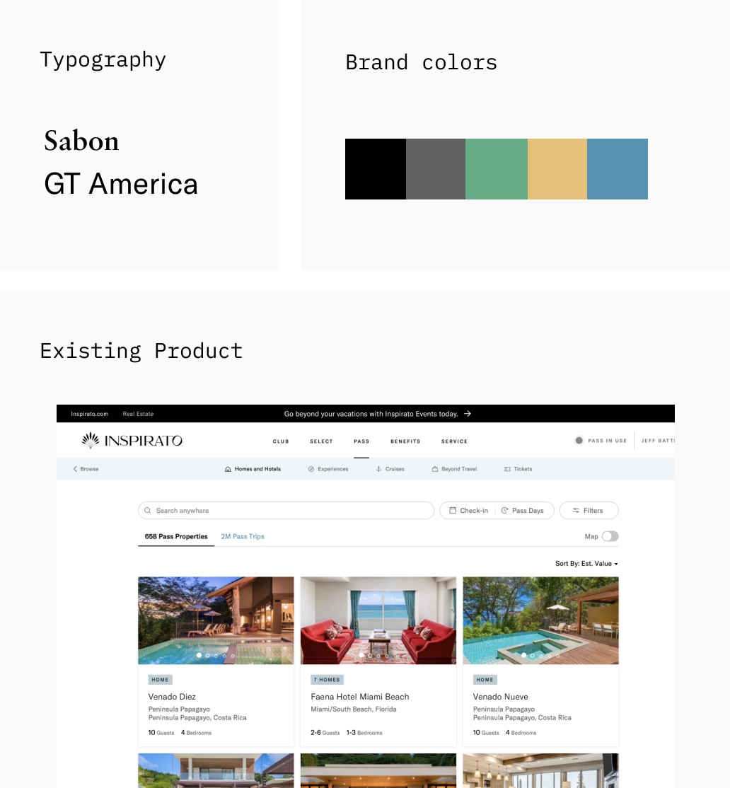 From the start, I wanted any design exploration to feel like a natural evolution of the Inspirato brand rather than a stark departure. I began by pulling existing artifacts and aligning with key stakeholders. The Brand team required us to retain the existing colors and typography, but beyond that, there was plenty of room to explore.